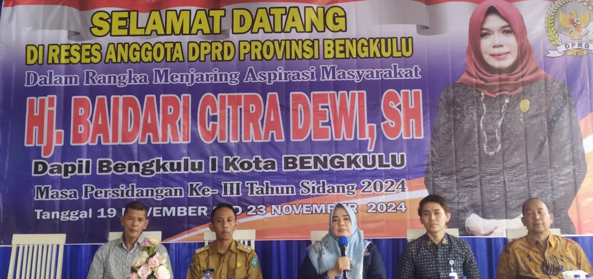 Indonesiaraja.com, Bengkulu - Anggota DPRD Provinsi Bengkulu, Hj. Baidari Citra Dewi, S.H, melaksanakan reses di Kelurahan Kandang Mas pada Selasa (19/11/2024). Acara ini dihadiri oleh sekitar 250 warga dari berbagai elemen masyarakat dan difokuskan pada penjaringan aspirasi masyarakat, khususnya di bidang pendidikan dan kesehatan.