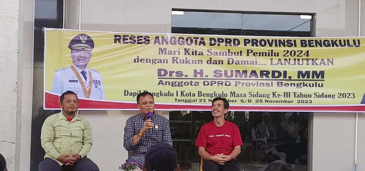Indonesiaraja.com, Bengkulu - Drs. H. Sumardi, M.M., Anggota DPRD Provinsi Bengkulu menggelar reses di Perumahan Graha Asri, RT 30 RW 09, Kelurahan Pekan Sabtu, Kota Bengkulu dalam Masa Sidang ke-III Tahun 2023 pada Selasa (21/11/2023).