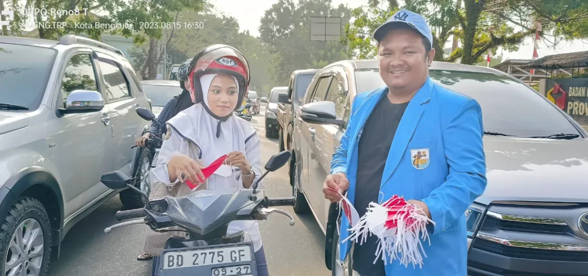 "Sore ini, kami dari jajaran KNPI Kota Bengkulu melaksanakan pemberian ratusan bendera merah putih ukuran kecil gratis di simpang lampu merah Padang Harapan dimana bendera yang kami bagikan ini harapannya dipasang di kendaraan baik di spion sepeda motor, stang sepeda ataupun spion mobil agar masyarakat dapat ikut memeriahkan HUT RI yang ke 78 tahun ini," ungkapnya