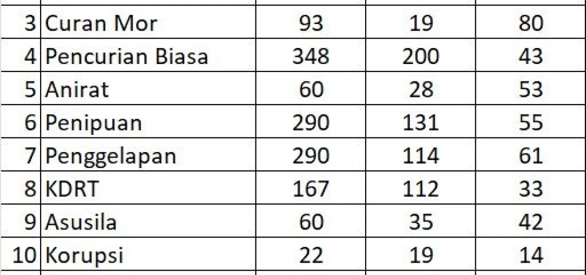 Tindak pidana lain yang juga cukup banyak dilaporkan adalah pencurian biasa, dengan total 348 laporan, yang berhasil diselesaikan sebanyak 200 laporan. Selain itu, kasus penipuan dan penggelapan tercatat masing-masing sebanyak 290 laporan. Dalam kasus penipuan, 131 laporan berhasil diselesaikan, sementara kasus penggelapan berhasil diselesaikan sebanyak 114 laporan.