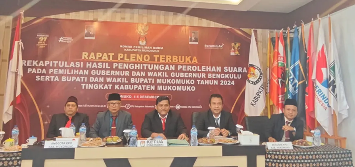 Rapat pleno rekapitulasi hasil penghitungan perolehan suara di KPU Kabupaten Mukomuko dipimpin langsung oleh Ketua KPU Mukomuko, Marjono, yang didampingi oleh Anggota KPU lainnya, yakni Deny Setiabudi, Efra Budiman, Endang Surya Bakti, Misbahul Amri, serta Sekretaris KPU Kabupaten Mukomuko, Marlon Sinaga.