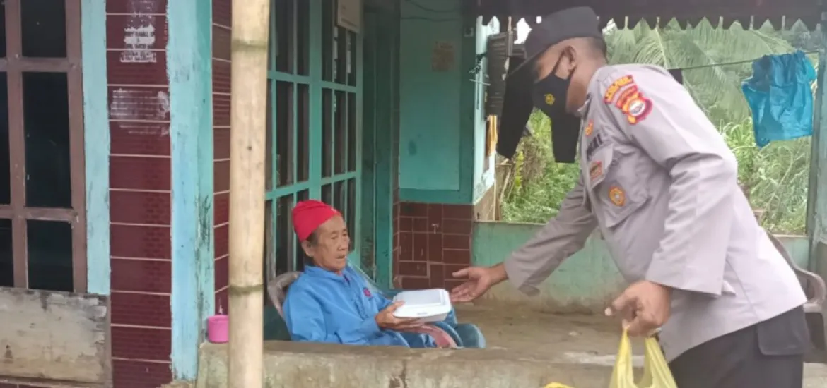 Polres Bengkulu Tengah (benteng) Polda Bengkulu bagikan bansos Polri berupa nasi kotak di Desa Lubuk Unen Lama Kecamatan Merigi Kelindang Kabupaten Bengkulu Tengah (Iraja/Irj019/FA)