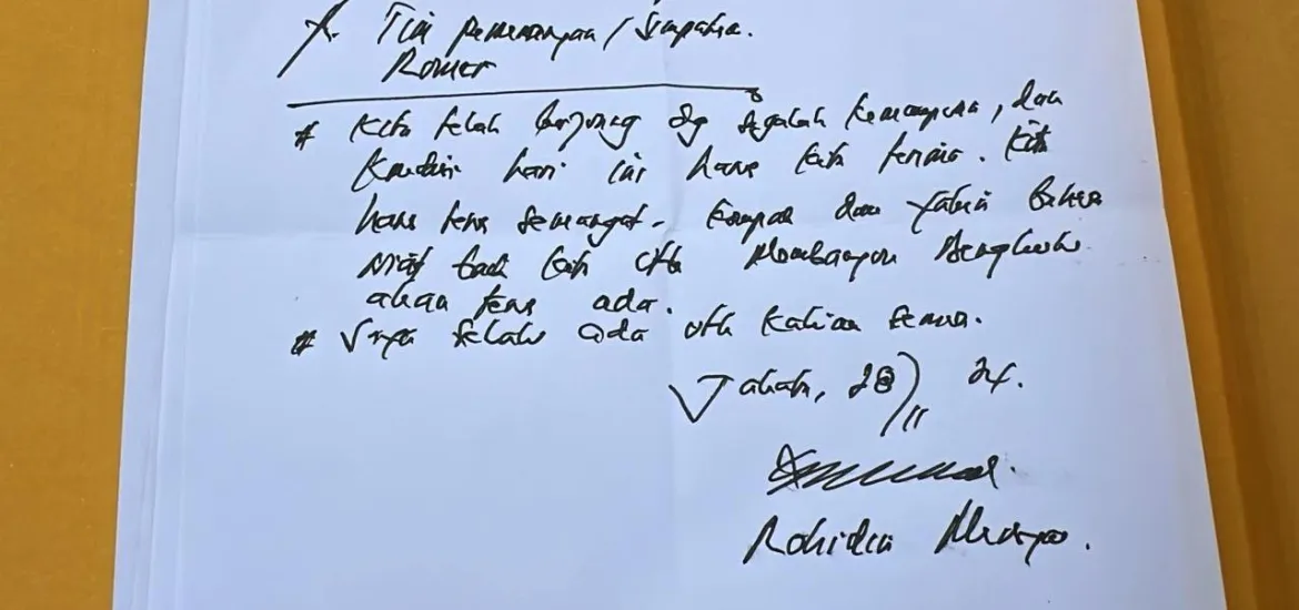 Pesan tulis tangan ini dibenarkan oleh Tim Usin Abdisyah Putra Sembiring, pesan itu dikirim melalui WA yang berisikan ucapan semangat dan selalu kompak.