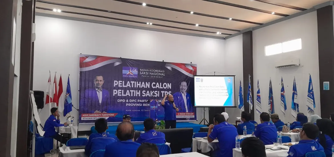 Indonesiaraja.com, Bengkulu - Dewan Pimpinan Daerah (DPD) Partai Demokrat Provinsi Bengkulu menggelar pelatihan bagi calon pelatih saksi Tempat Pemungutan Suara (TPS) untuk Pemilu tahun 2024 mendatang yang diselenggarakan di Adeeva Hotel & Convention, Pantai Panjang, Kota Bengkulu pada Minggu, 3 September 2023.