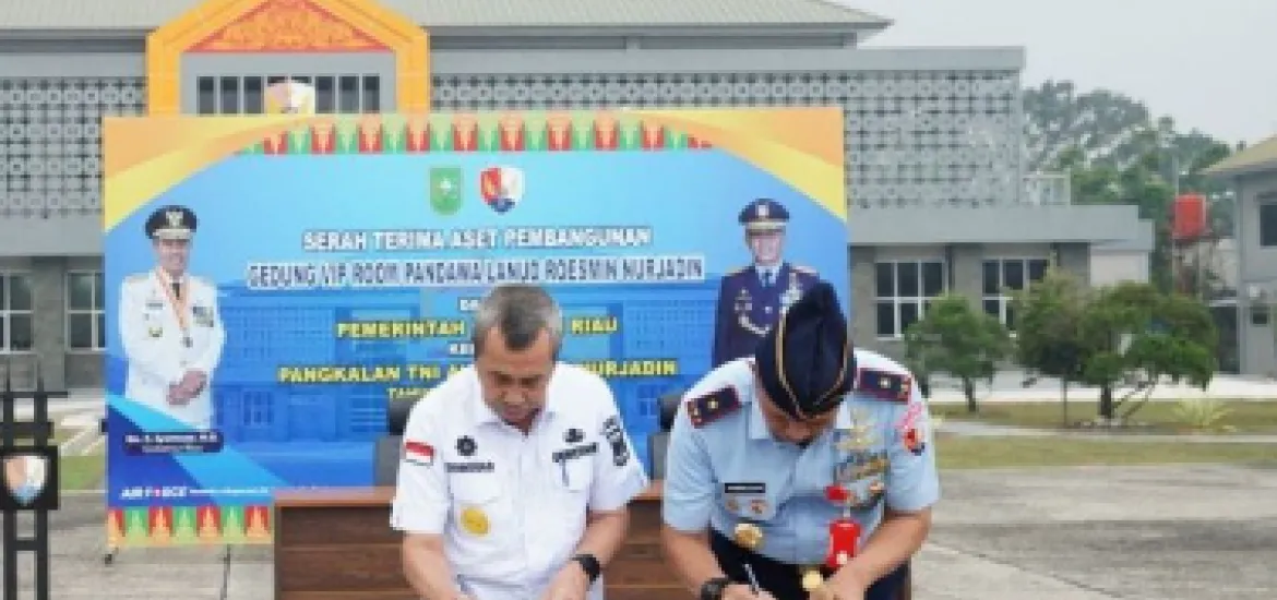 Indoensiaraja.com, Riau - Gubernur Riau, Syamsuar, serah terima aset pembangunan Gedung VIP Room Pandawa Lanud Roesmin Nurjadin dari Pemerintah Provinsi Riau kepada Pangkalan TNI AU Lanud Roesmin Nurjadin di Lapangan Apron Lanud Roesmin Nurjadin, Rabu (18/10/2023).