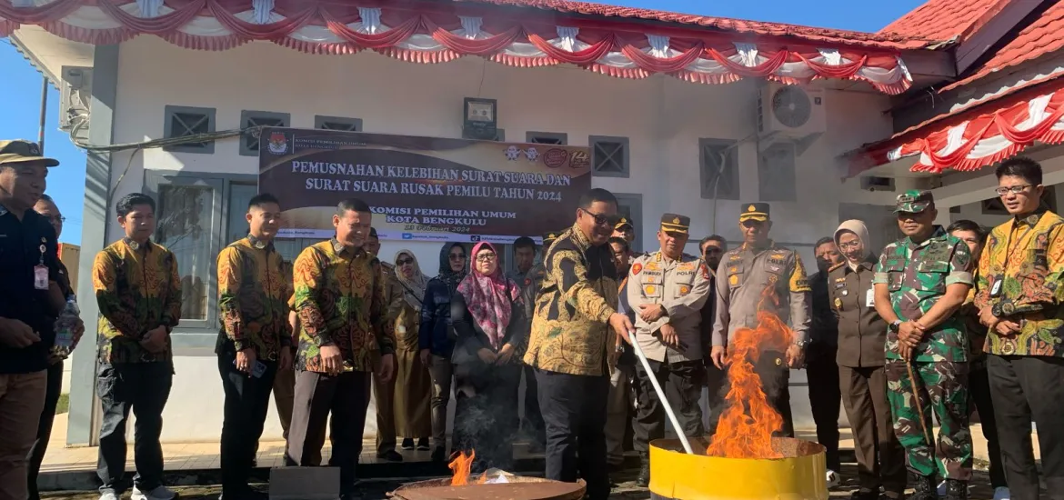Pemusnahan surat suara tersebut dilakukan oleh PJ Walikota, Ketua KPU, Kapolresta, dan unsur terkait lainya di halaman KPU Kota Bengkulu pada Selasa (13/02/2024).