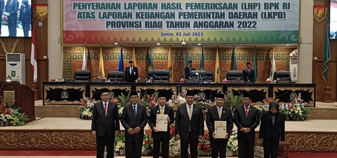 Indonesiaraja.com, Riau - BPK Perwakilan Provinsi Riau menyerahkan Laporan Hasil Pemeriksaan (LHP) atas Laporan Keuangan Pemerintah Daerah (LKPD) Tahun 2022 kepada Pemerintah Provinsi Riau. Bertempat di Gedung DPRD Provinsi Riau, rapat paripurna dipimpin dan dibuka oleh ketua DPRD Provinsi Riau Bpk. Yulisman, S.Si. Senin (3/7/23)