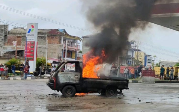 Satu Unit Pick Up Terbakar Di SPBU Kota Medan Saat Mengantri BBM