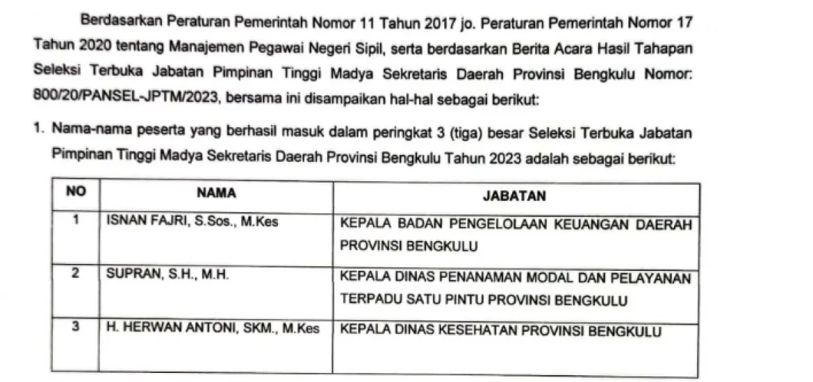 Untuk diketahui, bahwa Gubernur Bengkulu Rohidin Mersyah telah mengirimkan 3 nama calon Sekdaprov kepada Kemendagri.