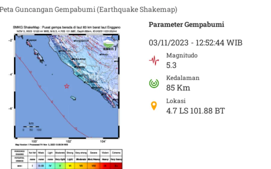 Indonesiaraja.com, Bengkulu - Gempa bumi yang mengguncang Enggano berkekuatan 5,3 Magnitudi pada puk