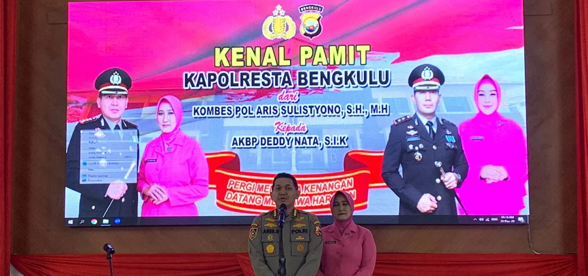 Indonesiaraja.com, Bengkulu - Polresta Bengkulu mengadakan Proses pisah sambut dan Serah terima jabatan (Sertijab) Kapolresta Bengkulu yang baru, Kombes Pol Aris Sulistyono, S.H, M.H yang sudah satu tahun menjabat menjadi Kapolresta Bengkulu dengan digantikan AKBP Deddy Nata, S.I.K di Gedung Aula Polresta Bengkulu, Sabtu (23/12/2023).